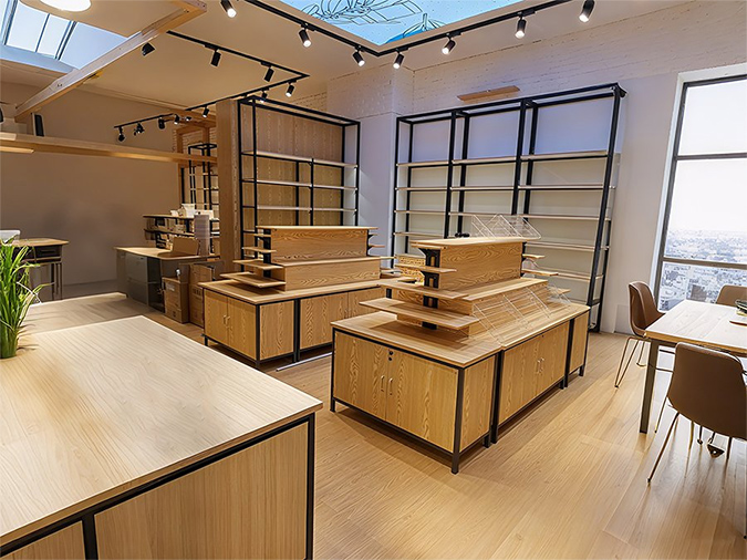 Upon entering the supermarket, the most immediate impression is the neat, orderly, and aesthetically pleasing design of the shelving. Mugulong's shelving features a minimalist and stylish design, employing a classic combination of light wood and black frames, showcasing a natural and rustic texture while maintaining a modern feel. The neatly arranged shelving creates spacious and airy shopping aisles, fostering a comfortable shopping environment for customers. The fresh produce display shelving cleverly blends wood grain texture with metal frames, presenting a natural and warm visual effect that aligns with the "fresh and natural" attributes of fresh produce, while the sturdy metal structure ensures the shelving's load-bearing capacity and durability. The "FRESH FARM" labeling area on the shelving further provides space for customized brand displays, helping merchants strengthen brand communication.