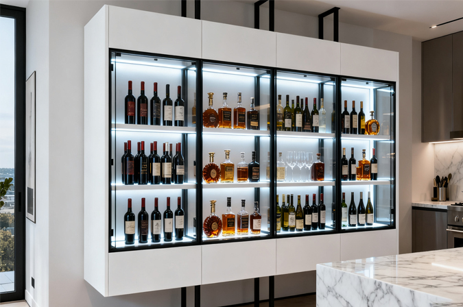Featuring a scientific upper-lower zoning structure, the shelving system includes a professional temperature-controlled wine display cabinet on the top level. With its transparent glass doors and soft built-in LED lighting, the cabinet perfectly showcases the color and texture of wines and other liquors. The lower section is a secure, enclosed storage unit specifically designed for premium tobacco products, ensuring centralized, unified, and professional management of tobacco and liquor items.